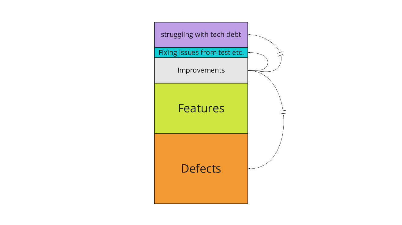 We talk to many teams in large organizations. When we ask them about what share of their time they spend on fixing defects, this is more often than not 50%. Because the defect work is taking such a large share of their team, the teams can get little work with customer value (‘feature work’) done, which increases the pressure on the team.